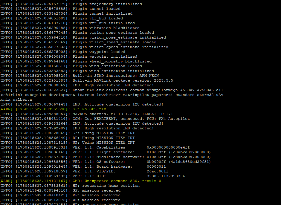 7. Start mavros: Run “roslaunch mavros apm.launch fcu_url:=” /dev/ttyTHS1:921600″ (modify according to the actual serial port name). If mavros runs successfully, it indicates a successful connection. The link has been established.
