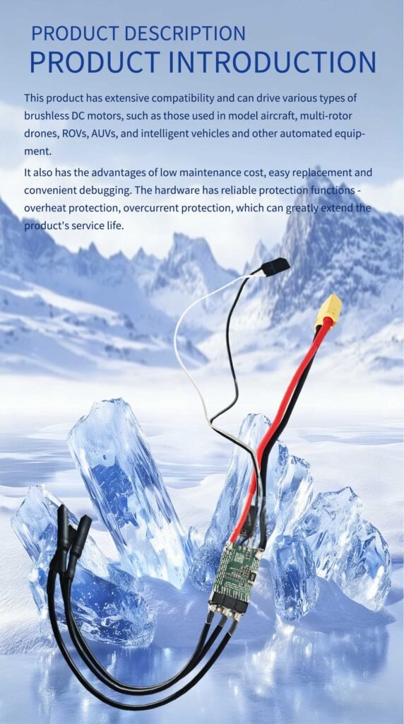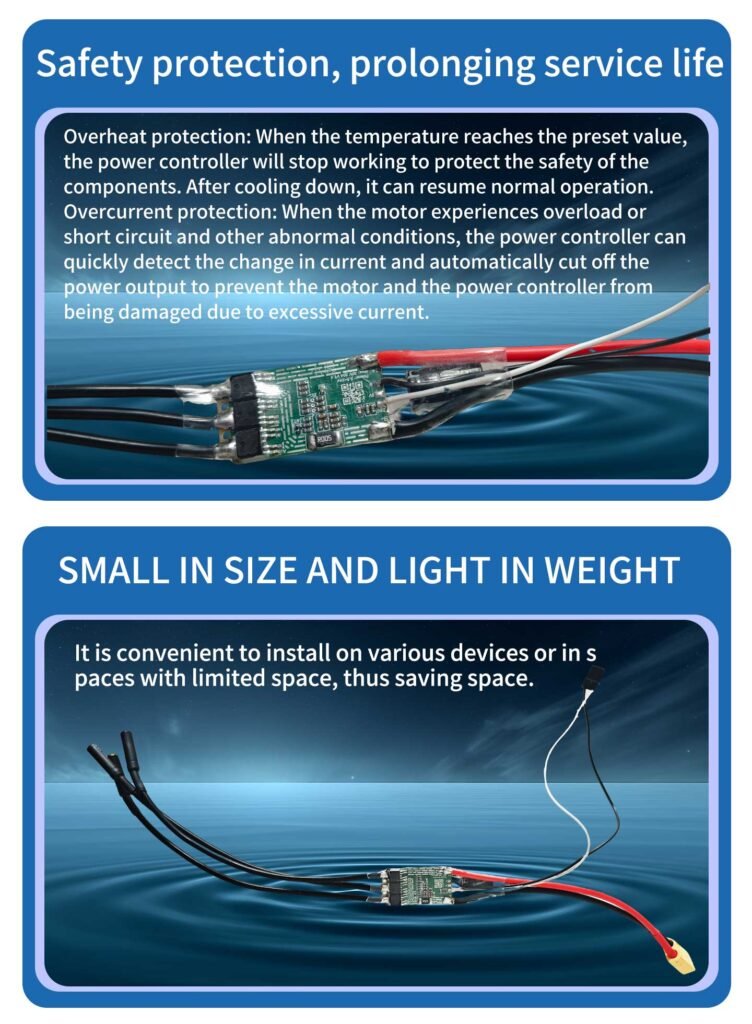 n the power system of unmanned vessels, the brushless electronic speed controller (ESC) serves as the “power center” that connects the battery and the brushless motor. It not only efficiently converts direct current into three-phase alternating current to drive the motor, but also directly affects the power response, endurance, and operational stability of the unmanned vessel. Especially in water operation scenarios, factors such as salt fog, humidity, and wave impacts impose higher requirements on the reliability and protection of the ESC. Therefore, precise selection is the key to ensuring the efficient and safe operation of unmanned vessels.