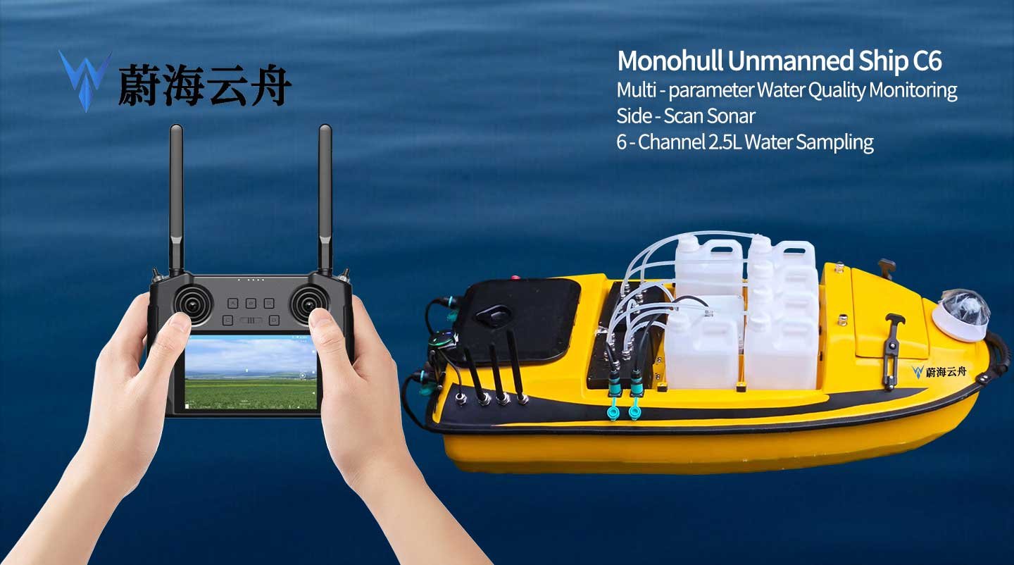 An unmanned patrol water sampling vessel on the water